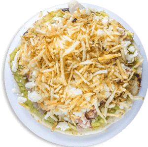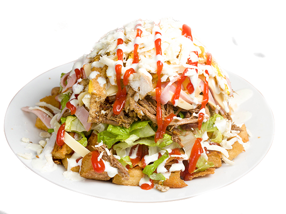Cerdo, pollo, maíz tierno, chicharrón, pavo ahumado, salami, peperoni, huevo frito, chorizo, madurito, carne molida, cebolla grillete, tocineta ahumada, champiñones, pico de gallo, guacamole queso fundido, salsa de la casa. $15.000